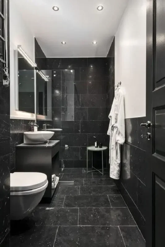 Optar por paredes pretas no banheiro pode parecer ousado, mas é uma escolha que funciona muito bem em diversos estilos. No entanto, é importante equilibrar a cor com outros elementos. Aqui vão algumas dicas: