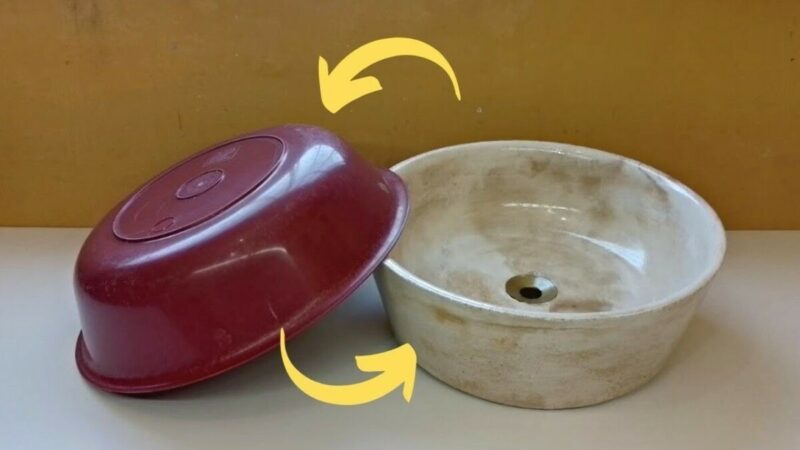 - Preparando as Bacias: Inicie removendo o fundo da bacia maior com uma serra, criando espaço para a cuba. Lixe o interior da bacia menor para que fique completamente liso, preparando-a para servir de molde interno.