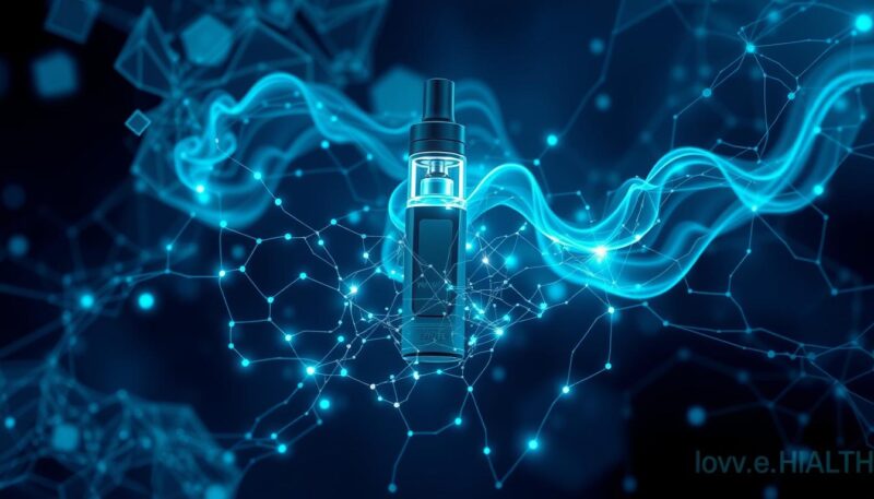 A futuristic vape device intertwined with neural network patterns, glowing with soft blue and green lights, surrounded by an abstract representation of data streams and digital interfaces, all set against a calming, ethereal background that suggests health and wellness.